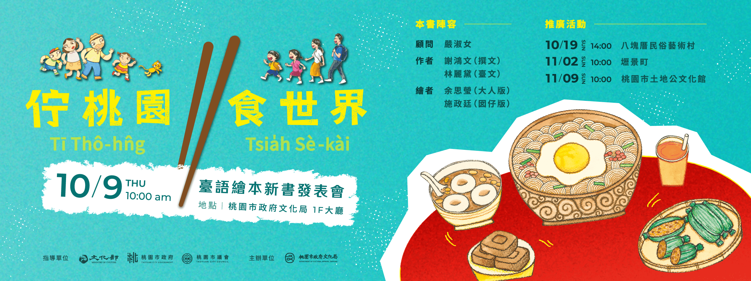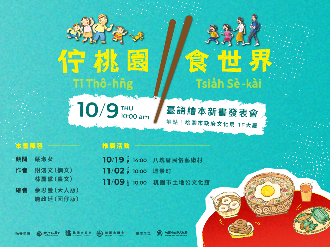 臺語繪本_電腦版-大人_s臺語繪本_電腦版-主視覺_s臺語繪本_電腦版-囡仔_s 臺語繪本_手機板-主視覺臺語繪本_手機板-囡仔臺語繪本_手機板-大人 這本書可以在學校、圖書館和社區一起親子共讀,也可以照著另附的食譜和家人一同製作美味料理,更可以讓全家大小坐在一起遊玩「好食物探險耍奕」桌遊,從遊戲體會桃園豐富的樣貌。快跟著小寶和貝貝,一起用臺語說故事、學料理,探索桃園這座多元又好吃的城市吧! MORE 食物不只是家鄉的味道,更是族群遷徙、生活智慧與人情風景的凝結。藉由繪本中小寶與貝貝闔家出遊的故事,邀請大小朋友一同展開一場味蕾與人文交織的探索之旅。期許這套繪本成為親子共讀、跨世代對話的媒介,也讓更多人以臺語說出家鄉故里的滋味,細細品嘗咱桃園豐厚而動人的文化日常。 MORE MORE