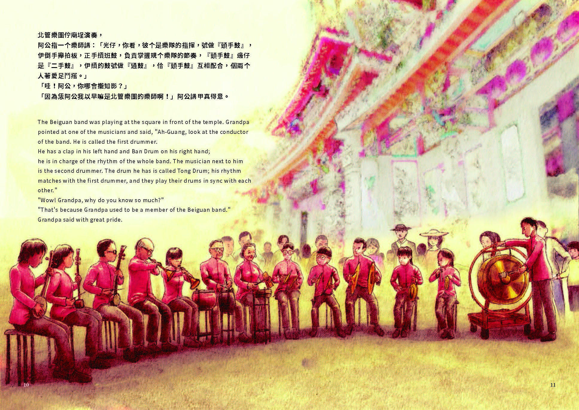 The north tube band was playing at the square in front of the temple. Grandpa pointed at one of the musicians and told me, “Ah-Guang, look at the conductor of the band, he is called the first drummer. He has a clap in his left hand and Ban Drum on his right hand; he is in charge of the rhythm of the whole band. The musician next to him is the second drummer. The drum he has is called Tong Drum; his rhythm matches with the first drummer, and they play their music in sync.”