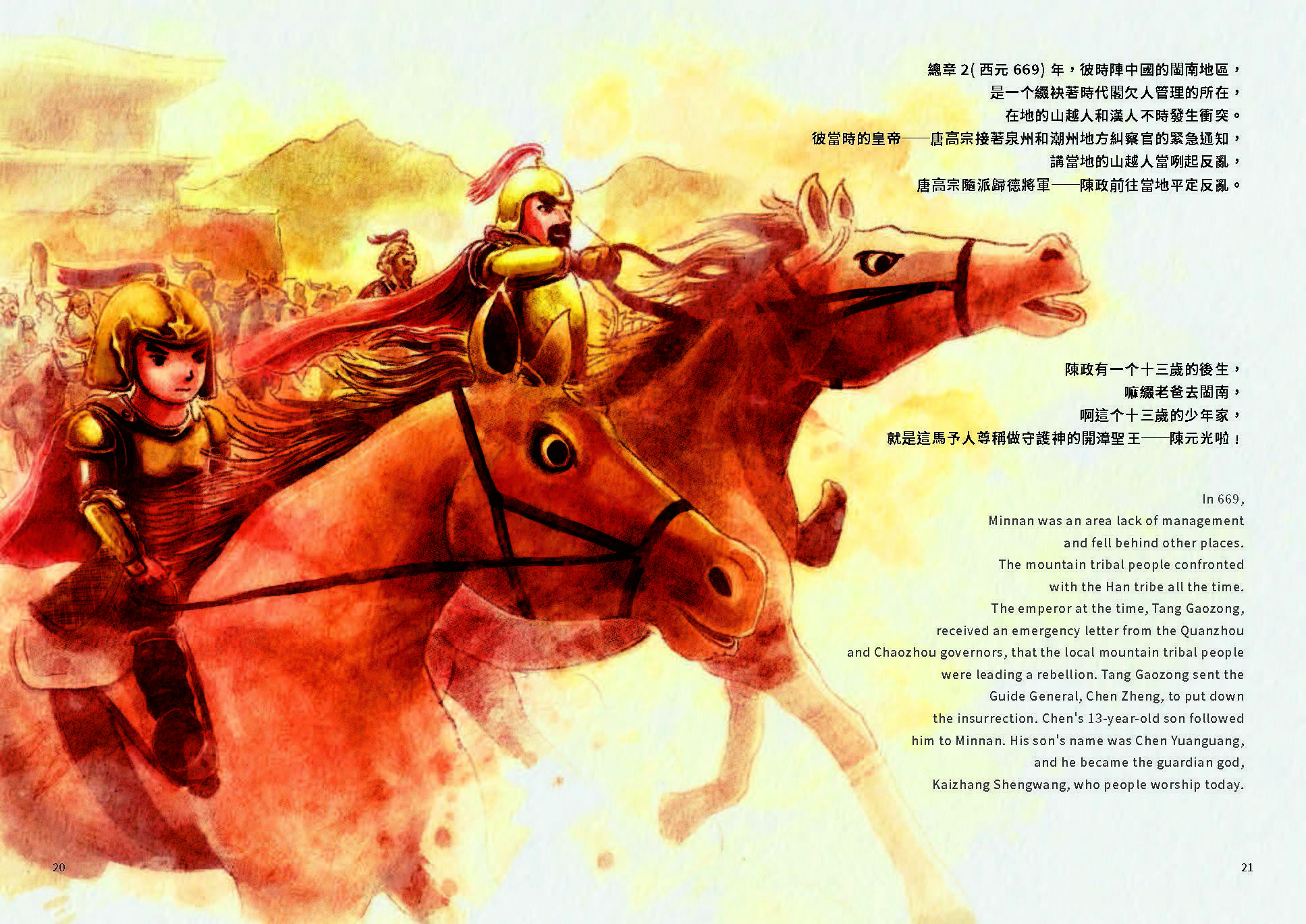 彼當時的皇帝──唐高宗接著泉州和潮州地方糾察官的緊急通知,講當地的山越人當咧起反亂, 唐高宗隨派歸德將軍──陳政前往當地平定反亂。陳政有一个十三歲的後生,嘛綴老爸去閩南,啊這个十三歲的少年家,就是這馬予人尊稱做守護神的開漳聖王陳元光啦!