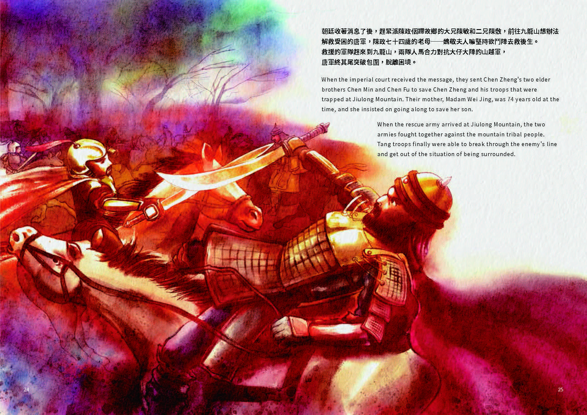 When the emperor received the message, he sent Chen Zhengs two elder brothers Chen Min and Chen Fu to save Chen Zheng and his troops that were trapped at the Jiulong Mountain. Their mother Madam Wei Jing was 74 years old at the time, and she insisted on going along to save her son. When the rescuing army arrived at Jiulong Mountain, the two armies fought together against the mountain tribal people. Tang troops finally were able to break through the enemy’s line and get out of the situation of being surrounded.