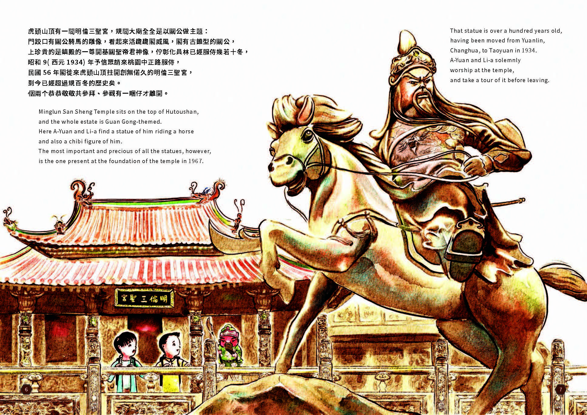 Minglun San Sheng Temple sits on the top of Hutoushan, and the whole estate is Guan gong-themed. Here A-Yuan and Li-a find a statue of him riding a horse and also a chibi figure of him. The most important and precious of all the statues, however, is the one present at the foundation of the temple in 1967.