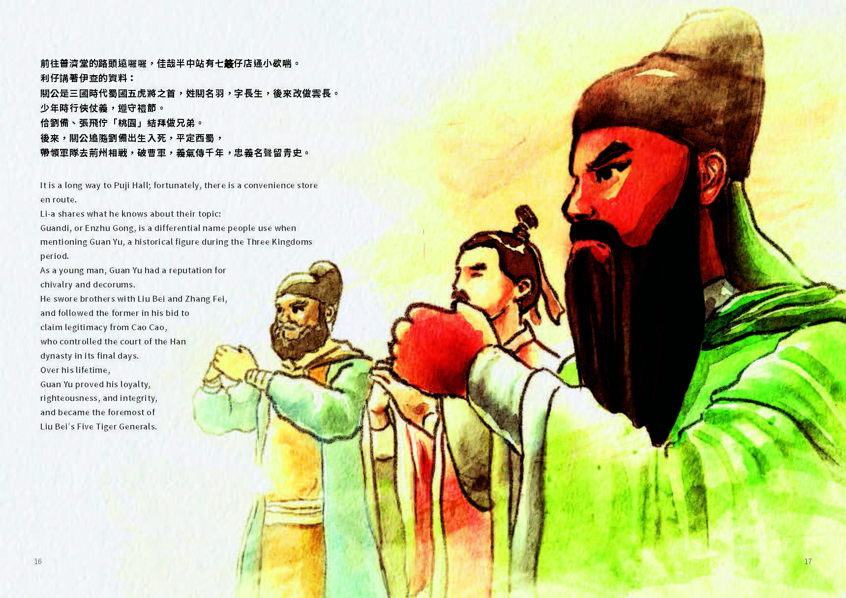 It is a long way to Puji Hall; fortunately, there is a convenience store en route. Li-a shares what he knows about their topic: Guandi, or Enzhu gong, is a deferential name people use when mentioning Guan Yu, a historical figure during the Three Kingdoms period. As a young man, Guan Yu had a reputation for chivalry and decorums. He swore brothers with Liu Bei and Zhang Fei, and followed the former in his bid to claim legitimacy from Cao Cao, who controlled the court of the Han dynasty in its final days. Over his lifetime, Guan Yu proved his loyalty, righteousness, and integrity, and became the foremost of Liu Bei’s Five Tiger Generals.