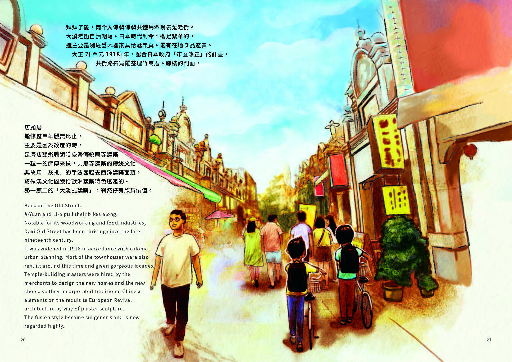 Back on the Old Street, A-Yuan and Li-a pull their bikes along. Notable for its woodworking and food industries, Daxi Old Street has been thriving since the late nineteenth century. It was widened in 1918 in accordance with colonial urban planning.
