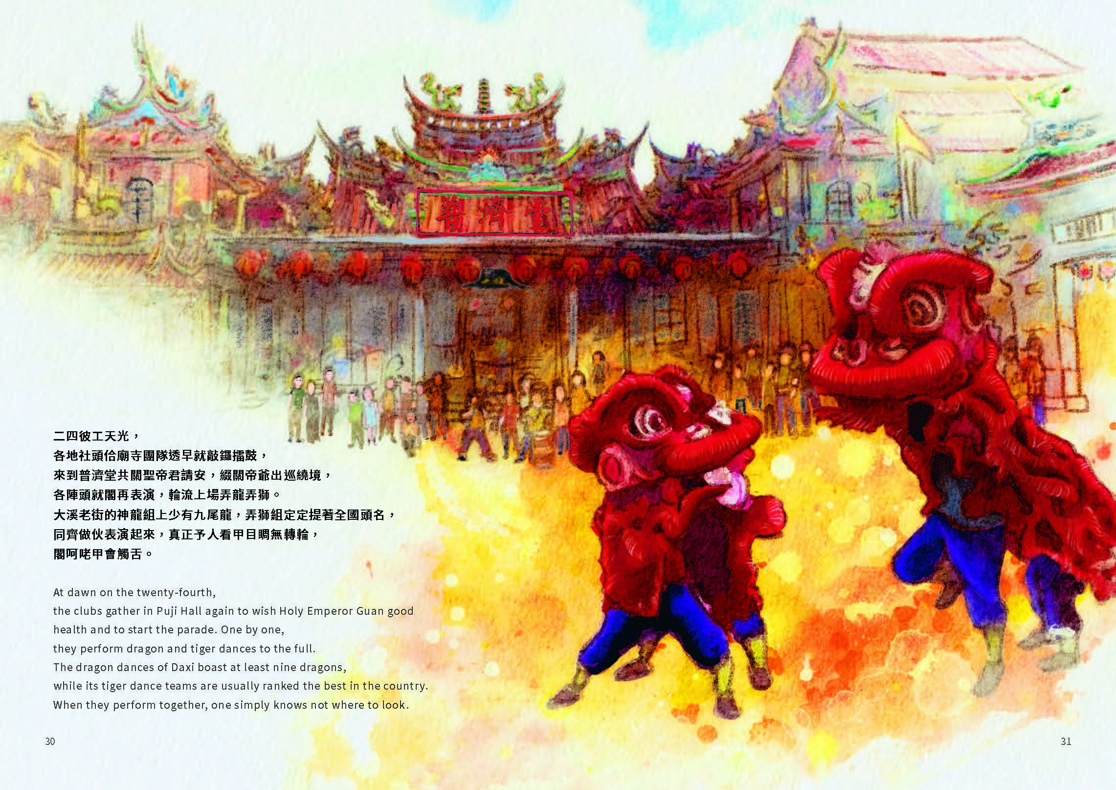 At dawn on the twenty-fourth, the clubs gather in Puji Hall again to wish Holy Emperor Guan good health and to start the parade. One by one, they perform dragon and tiger dances to the full. The dragon dances of Daxi boast at least nine dragons, while its tiger dance teams are usually ranked the best in the country. When they perform together, one simply knows not where to look.