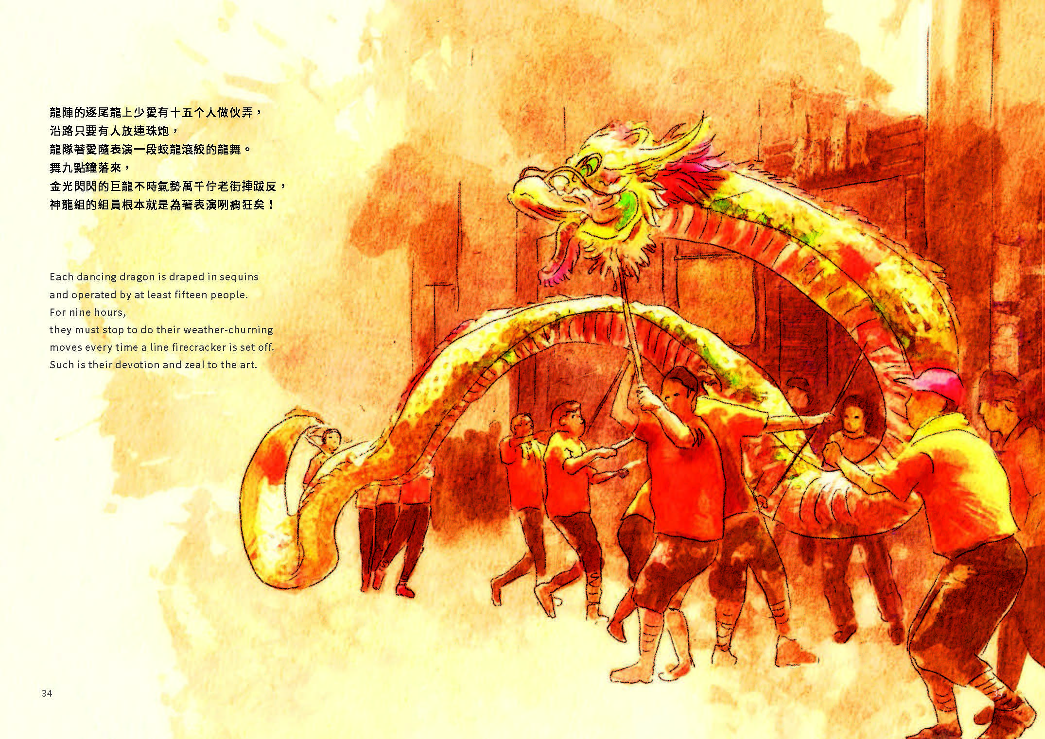 Each dancing dragon is draped in sequins and operated by at least fifteen people. For nine hours, they must stop to do their weather-churning moves every time a line firecracker is set off. Such is their devotion and zeal to the art.