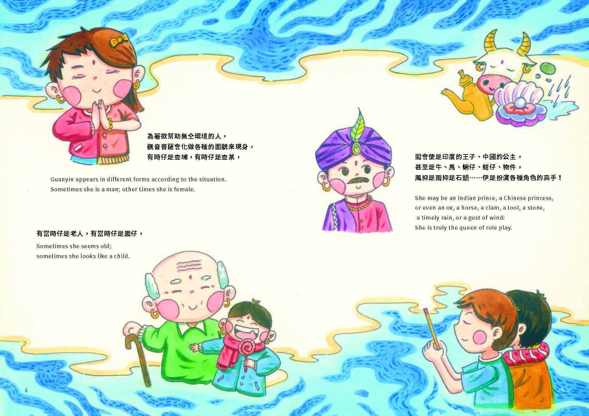 為著欲幫助無仝環境的人,觀音菩薩會化做各種的面貌來現身,有時仔是查埔,有時仔是查某,有當時仔是老人,有當時仔是囡仔,閣會使是印度的王子、中國的公主,甚至是牛、馬、蜊仔、蚶仔、物件,風抑是雨抑是石頭……伊是扮演各種角色的高手!…