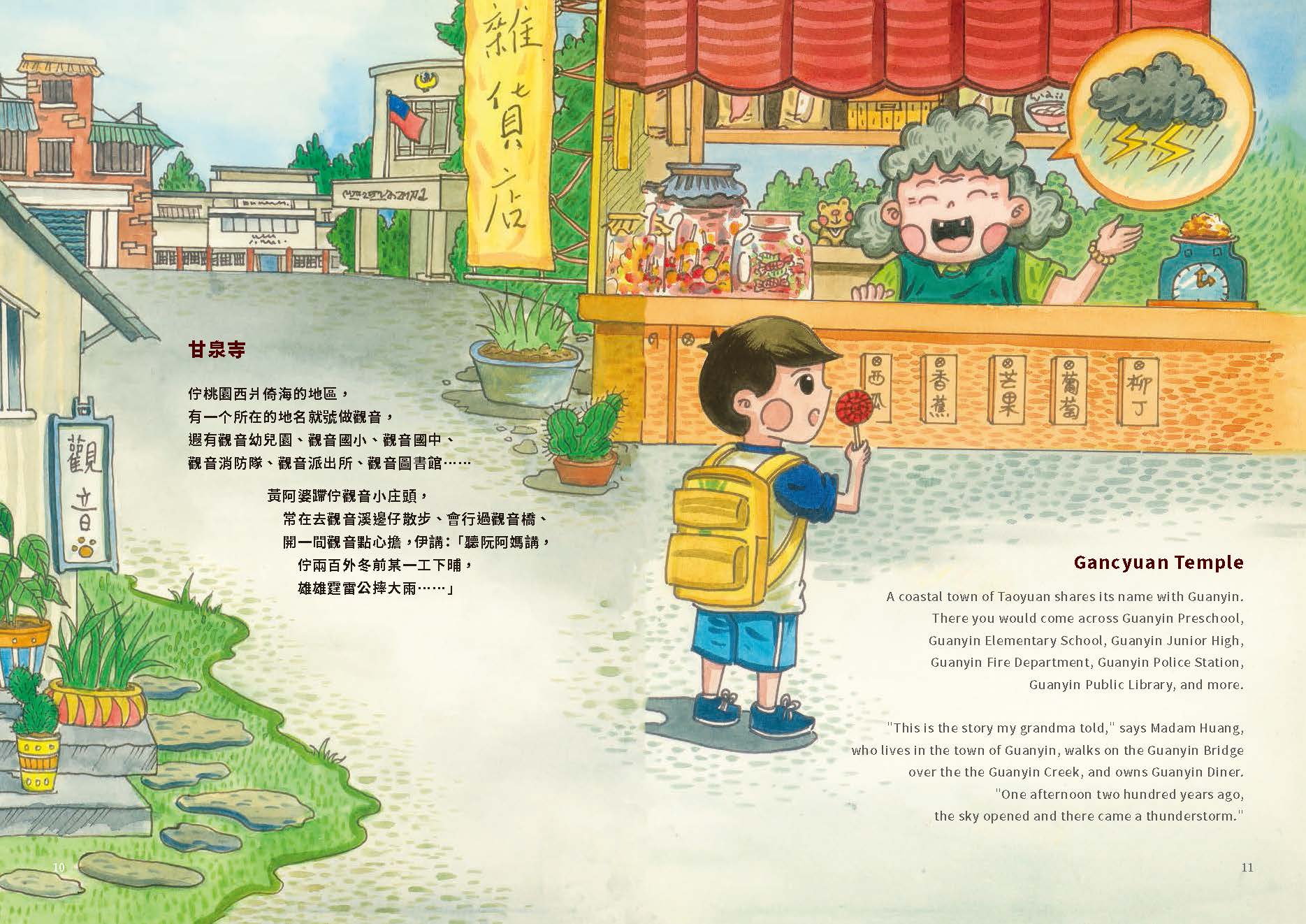 A coastal town of Taoyuan shares its name with the bodhisattva. There you would come across Guanyin Preschool, Guanyin Elementary School, Guanyin Junior High, Guanyin Fire Department, Guanyin Police Station, Guanyin Public Library, and more. “This is the story my grandma told,” says Madam Huang, who lives in the town of Guanyin, walks the Guanyin Bridge over the Guanyin Creek, and owns Guanyin Diner. “One afternoon two hundred years ago, the sky opened and there came a thunderstorm.”