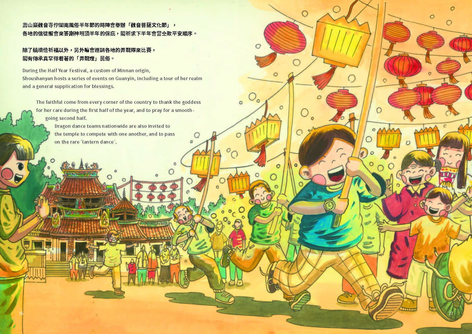 During the Half Year Festival, a custom of Minnan origin, Shoushanyan hosts a series of events on Guanyin, including a tour of her realm and a general supplication for blessings. The faithful come from every corner of the country to thank the goddess for her care during the first half of the year, and to pray for a smooth-going second half.