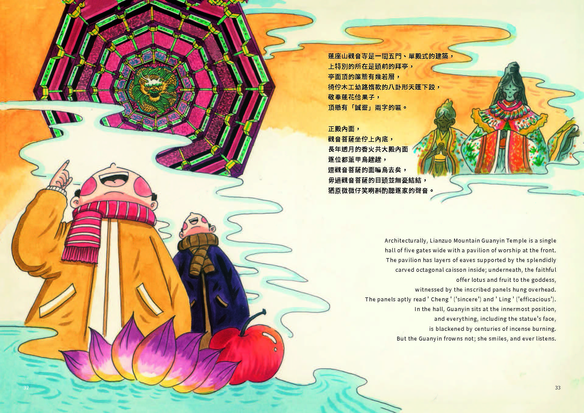Architecturally, Lianzuo Mountain Guanyin Temple is a single hall of five gates wide with a pavilion of worship at the front. The pavilion has layers of eaves supported by the splendidly carved octagonal caisson inside; underneath, the faithful offer lotus and fruit to the goddess, witnessed by the inscribed panels hung overhead. The panels aptly read cheng (sincere) and ling (efficacious).