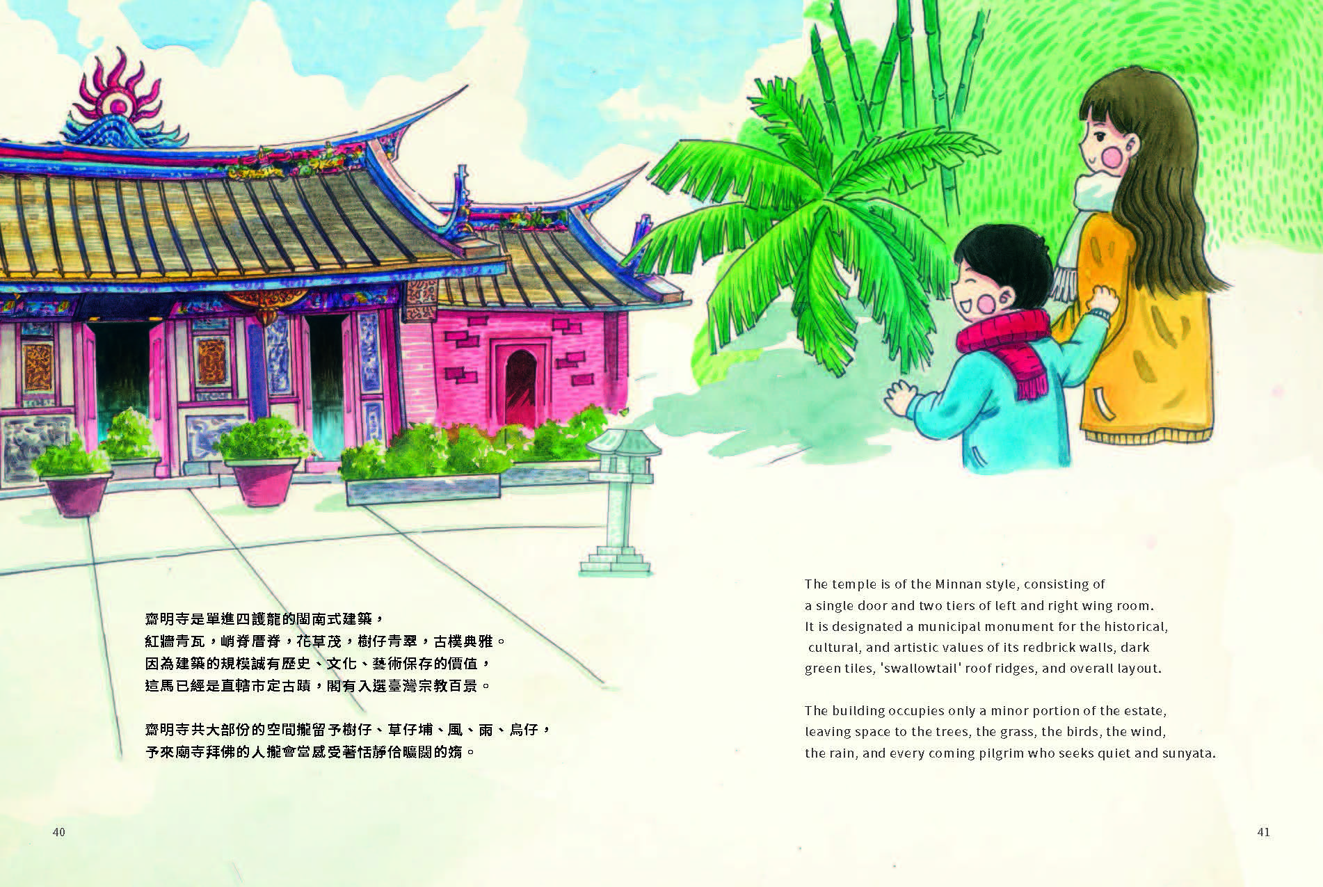 齋明寺共大部份的空間攏留予樹仔、草仔埔、風、雨、鳥仔,予來廟寺拜佛的人攏會當感受著恬靜佮曠闊的媠。