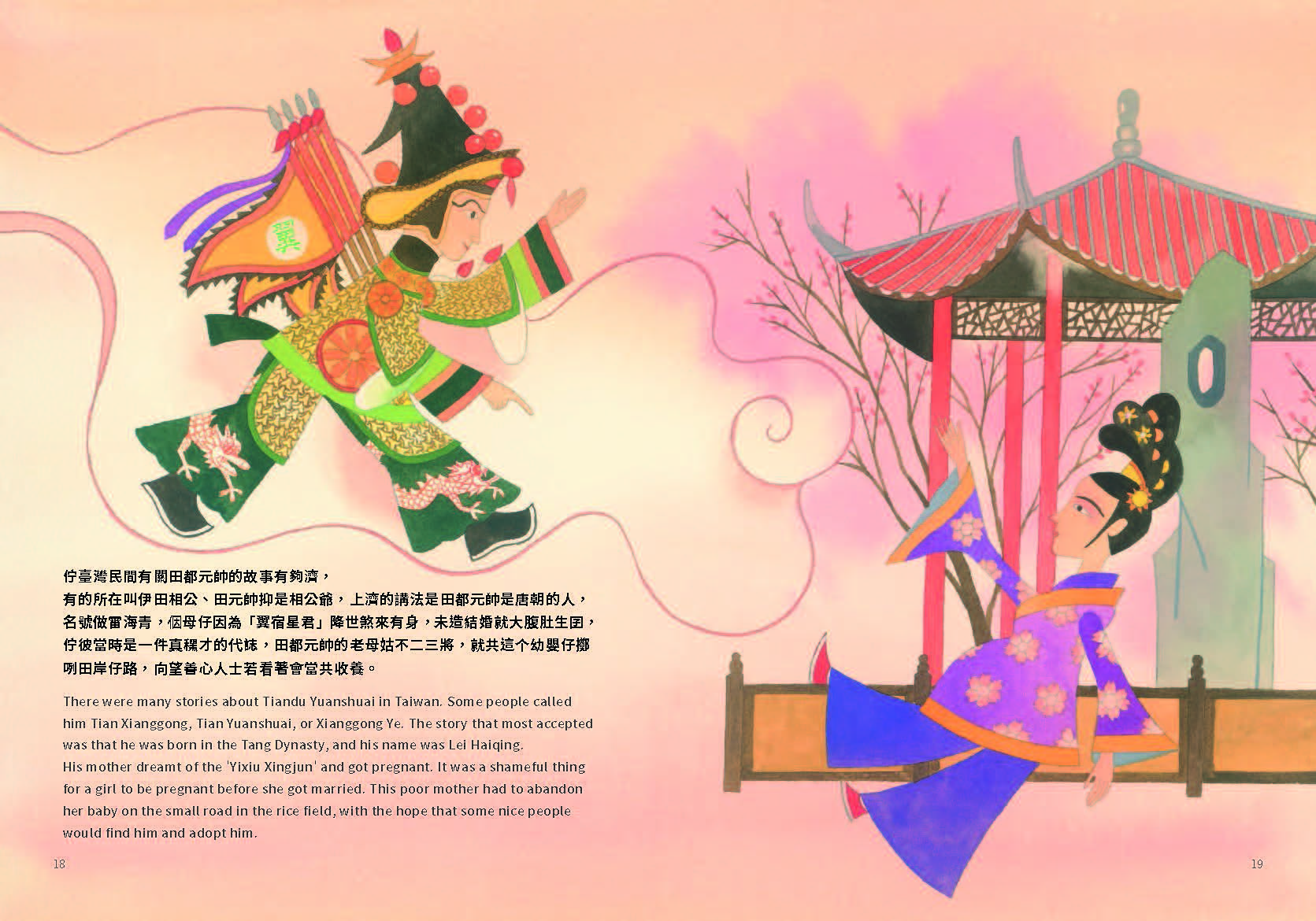 There were many stories about Tiandu Yuanshuai in Taiwan. Some people called him Tian Xianggong, Tian Yuanshuai, or Xianggong Ye. The story that most accepted was that he was born in the Tang Dynasty, and his name was Lei Haiqing. His mother dreamt of the ‘Yixiu xingjun’ and got pregnant. It was a shameful thing for a girl to be pregnant before she was married. This poor mother had to abandon her baby on the small road in the rice field, with the hope that some nice people would find him and adopt him.
