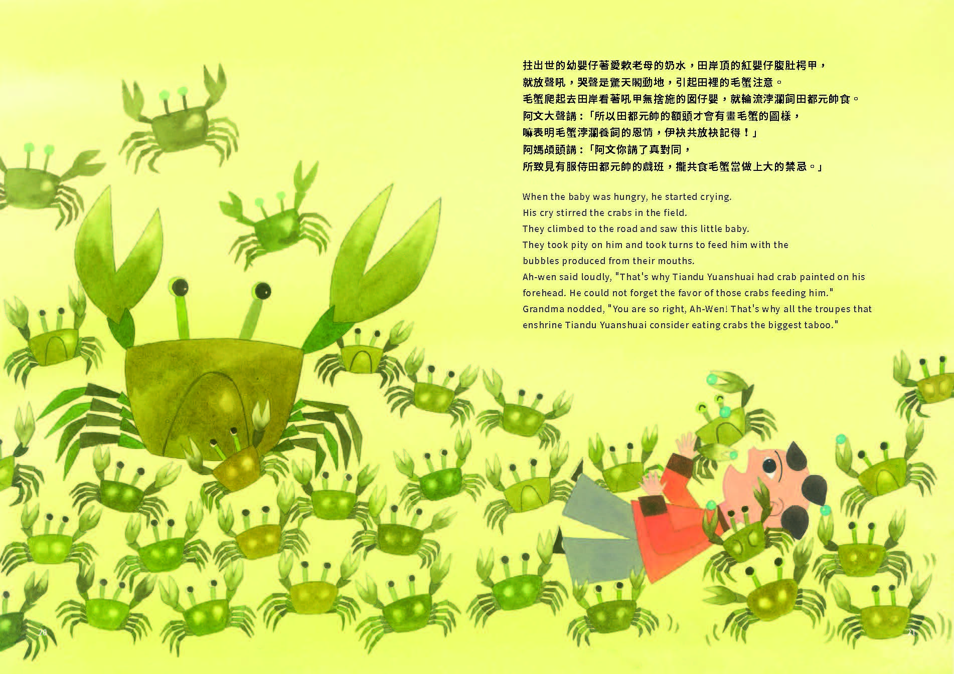 When the baby was hungry, he started crying. His cry stirred the crabs in the field. They climbed to the road and saw this little baby. They took pity on him and took turns to feed him with the bubbles produced from their mouths.