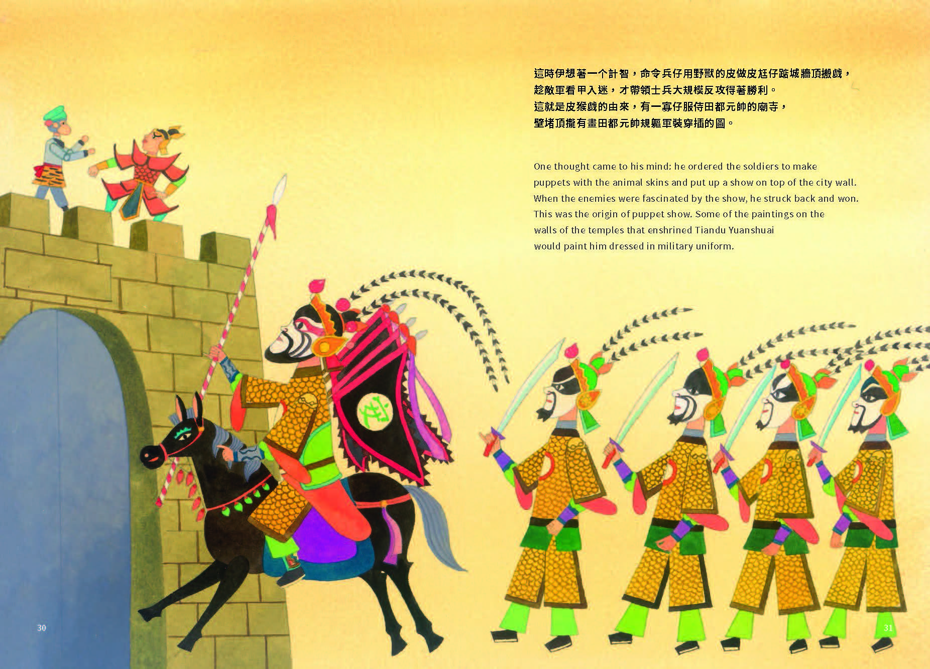 這時伊想著一个計智,命令兵仔用野獸的皮做皮尪仔踮城牆頂搬戲,趁敵軍看甲入迷,才帶領士兵大規模反攻得著勝利。