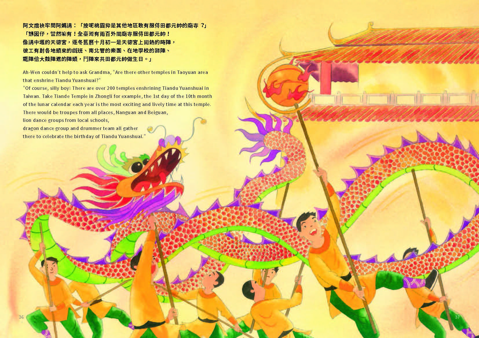 “Of course, silly boy! There are over 200 temples enshrining Tiandu Yuanshuai in Taiwan. Take Tiande Temple in Zhongli for example, the 1st day of the 10th month of the lunar calendar each year is the most exciting and lively time at this temple. There would be troupes from all places, nanguan and beiguan, lion dance groups from local schools, dragon dance group and drummer team all gather there to celebrate the birthday of Tiandu Yuanshuai.