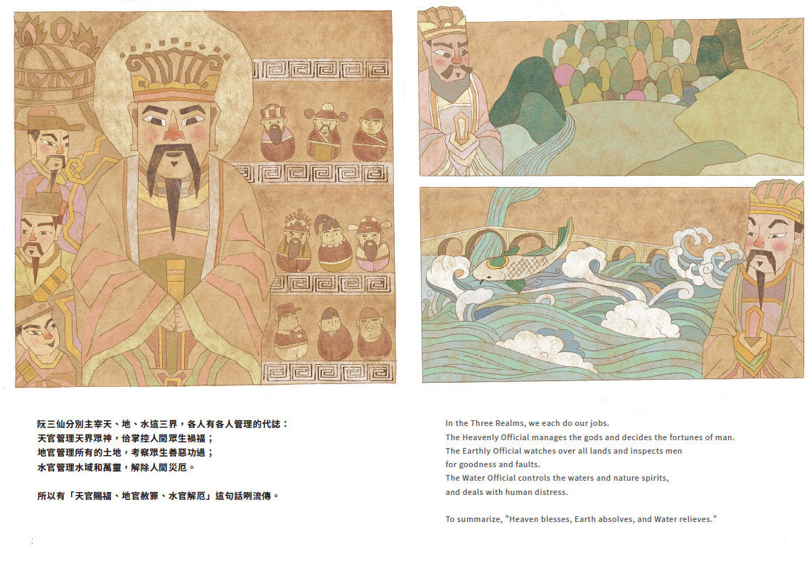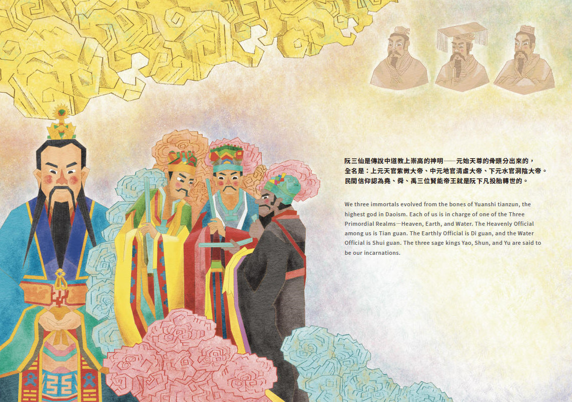 We three immortals evolved from the bones of Yuanshi tianzun, the highest god in Daoism. Each of us is in charge of one of the Three Primordial Realms—Heaven, Earth, and Water. The Heavenly Official among us is Tian guan. The Earthly Official is Di guan, and the Water Official is Shui guan. The three sage kings Yao, Shun, and Yu are said to be our incarnations.